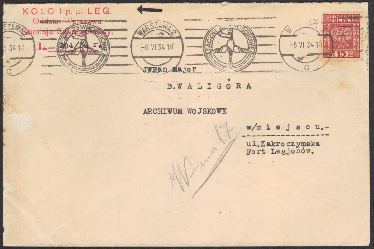 1932 wydanie obiegowe "doniczki", 15 gr - frankatura pojedyncza, list miejscowy nadany 6 VI 1934 w urzędzie Warszawa 2, znaczek skasowany stemplem mechanicznym "PACZKI ŻYWNOŚCIOWE" (wyróżnik "c"), czterowierszowa pieczęć nadawcy "KOŁO 1 p.p. LEG. Oddział Warszawa Komisja Samopomocy"; dobry stan zachowania (Myślicki 32 124). | Fi.253 Mi.274 |