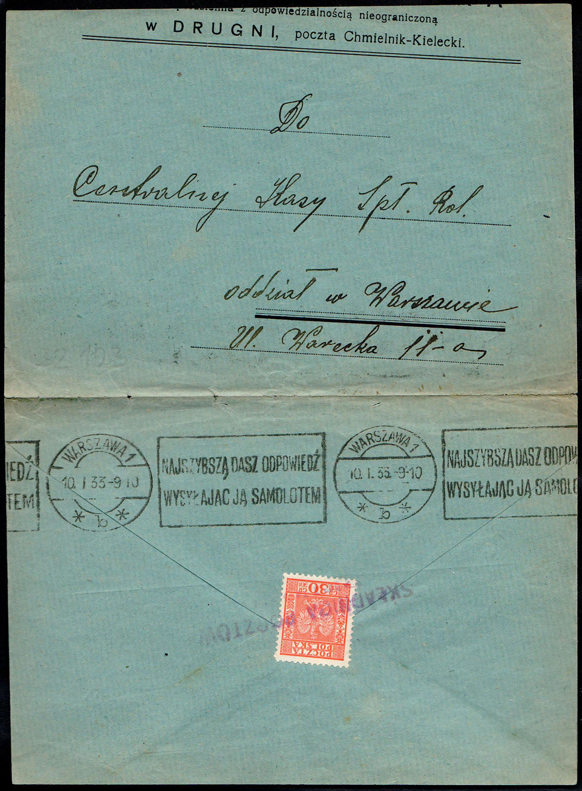 1933 Składnica Pocztowa DRUGNIA, przycięty list firmowy wysłany z pośrednictwa pocztowego w Drugni do Warszawy, znaczek skasowany na rewersie koperty pieczątką SKŁADNICA POCZTOWA. | Fi.256 |