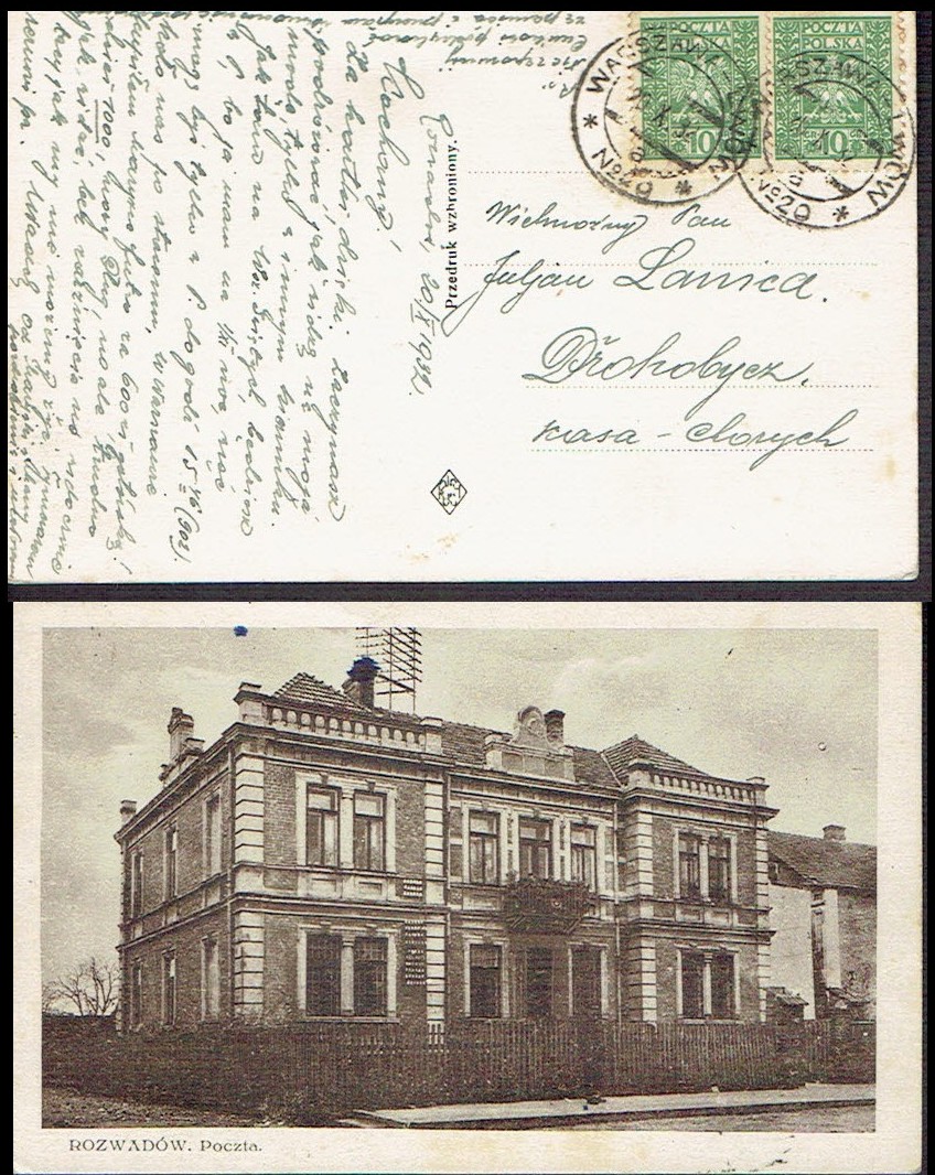 1932 kartka nadana w ambulansie pocztowym nr 20 na trasie Warszawa - Lwów, datownik z wyróżnikiem a, na widokówce Rozwadów - Poczta. | |