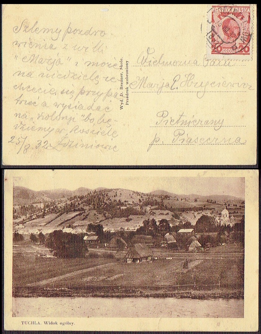 1932 kartka nadana w ambulansie pocztowym nr 381 na trasie Ławoczne - Lwów, datownik z wyróżnikiem b, na widokówce Tuchla - Widok ogólny. | |