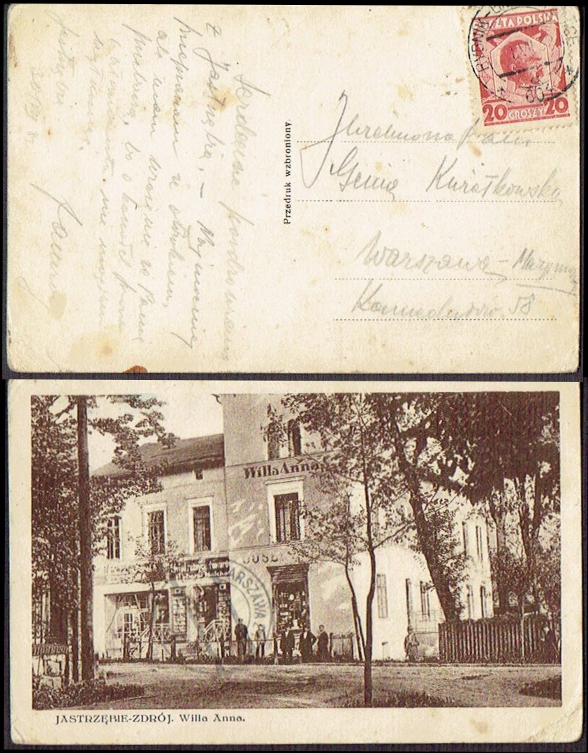 1932 kartka nadana w ambulansie pocztowym nr 604 na trasie Rybnik - Gierałtowice, datownik z wyróżnikiem a, na widokówce Jastrzębie Zdrój - Willa Anna. | |