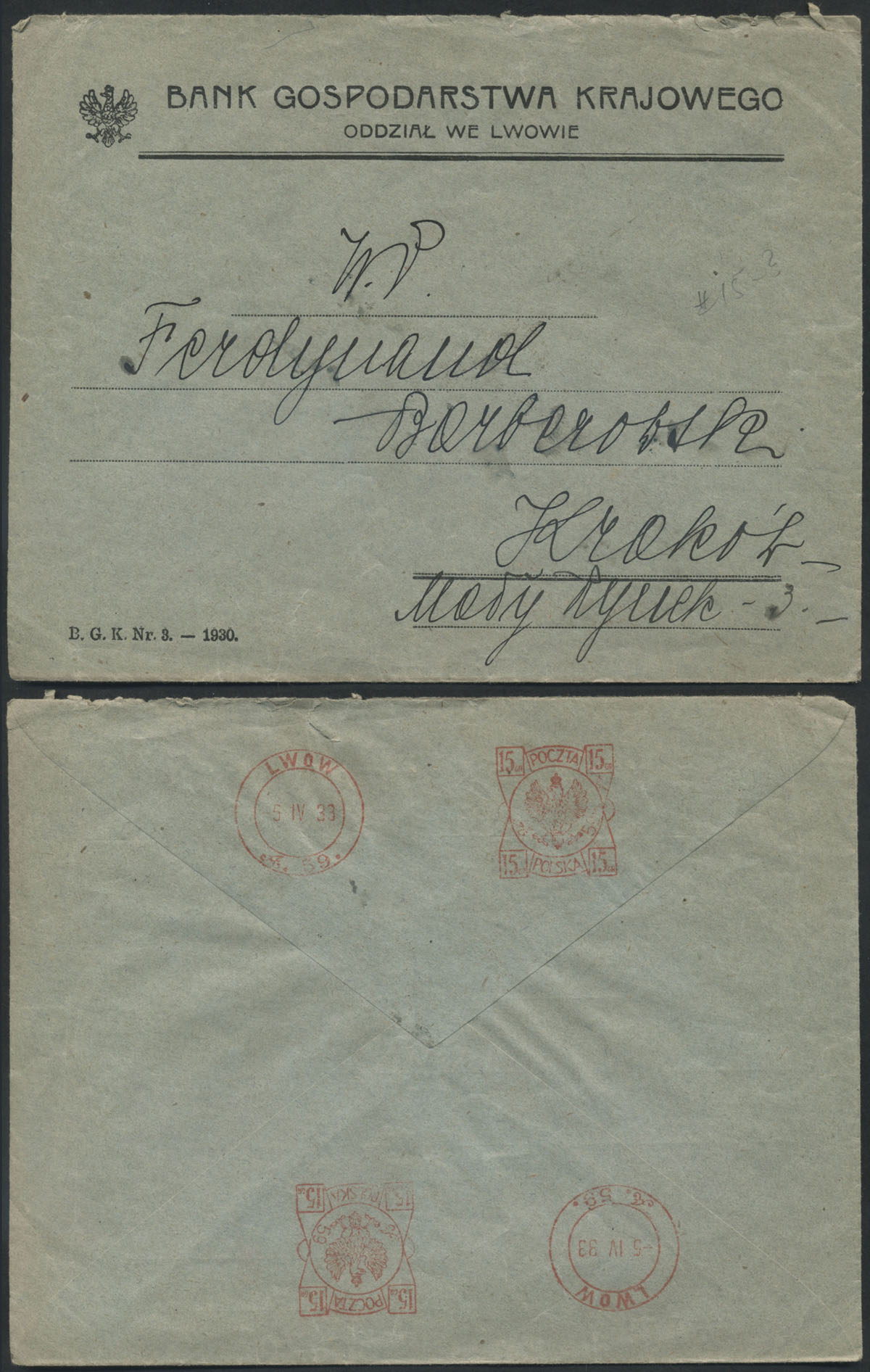 1933 list z Banku Gospodarstwa Krajowego w Lwowie do Krakowa opłacony na odwrocie wielokrotną frankaturą mechaniczną nr "A. 59.". | |