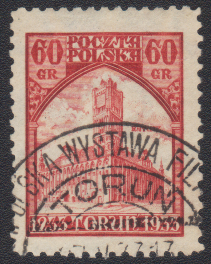 1933 II Wszechpolska Wystawa Filatelistyczna w Toruniu, znaczek za 60 gr. z rzadkim położeniem znaku wodnego - W.II.D trąbki w dół (Fi.250.-) ze stemplem okolicznościowym, przed ratuszem pomnik Mikołaja Kopernika. | Fi.260D Mi.281Y |