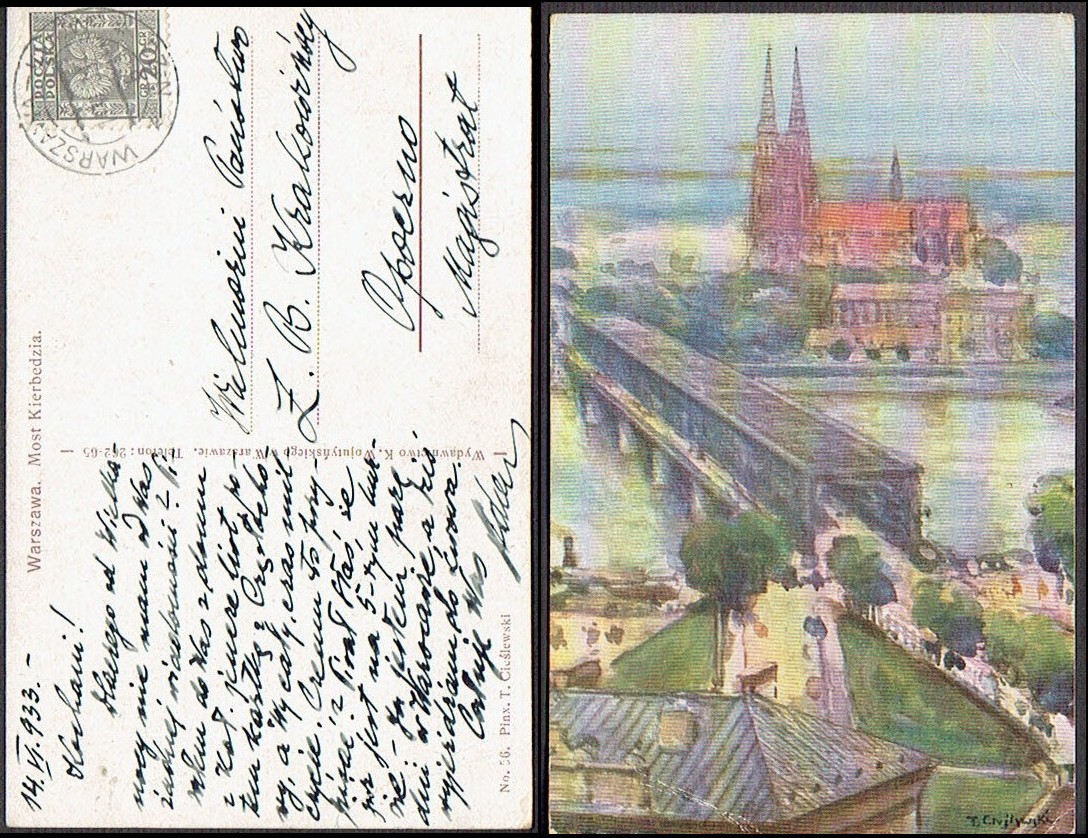 1933 kartka nadana w ambulansie pocztowym nr 20 na trasie Warszawa - Lwów, datownik z wyróżnikiem b, na widokówce Warszawa - Most Kierbedzia. | |
