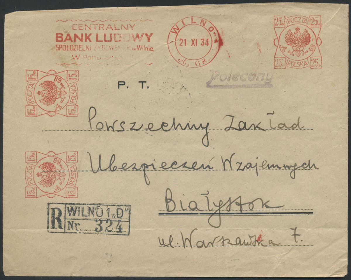 1934 firmowy list polecony z Banku Ludowego Spółdzielni Żydowskich w Wilnie do Białegostoku opłacony wielokrotną frankaturą mechaniczną nr "A. 68.", na odwrocie stempel odbiorczy. | |