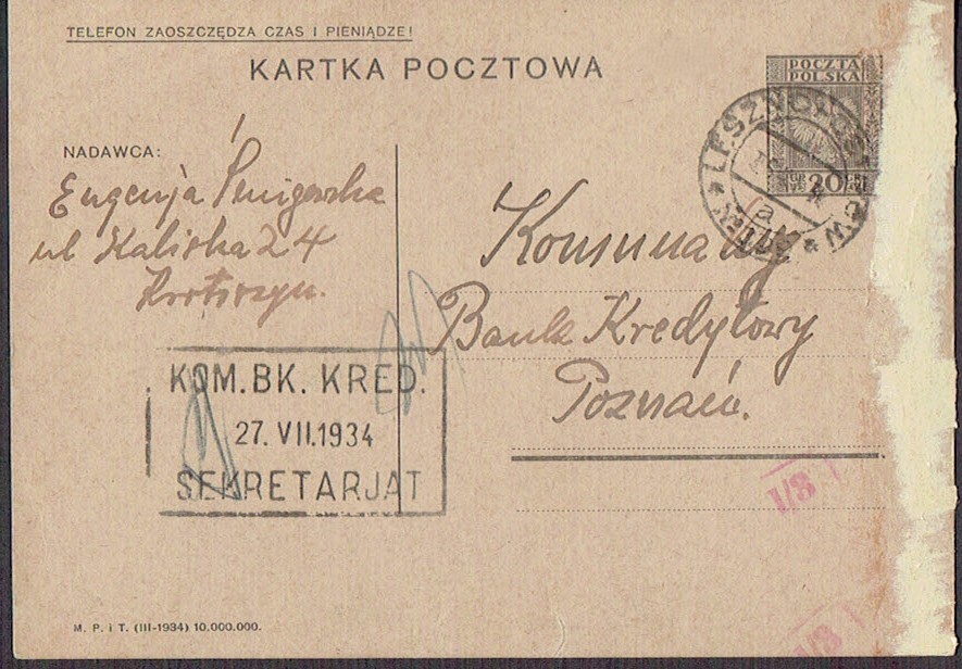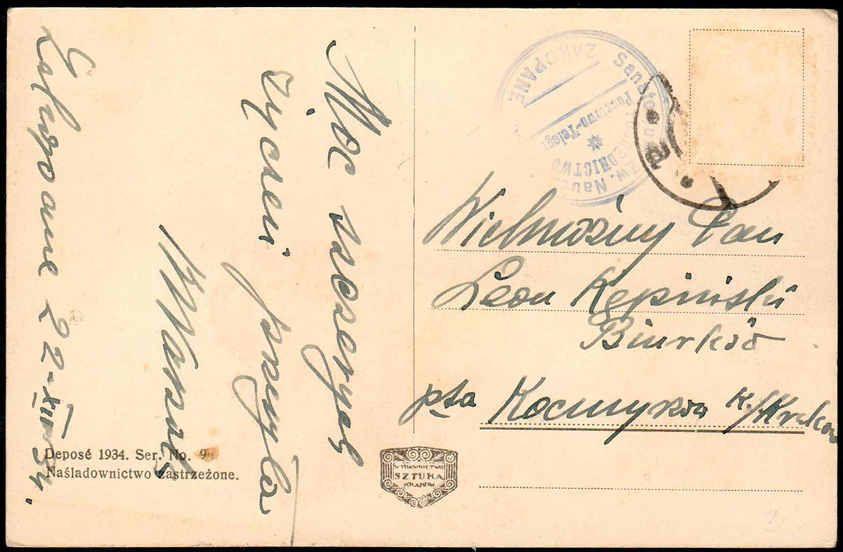 1934 Pośrednictwo Pocztowe Sanatorium Zw. Naucz. Szk. Pow. w Zakopanem, kartka z Zakopanego do Kocmyrzowa, niebieski okrągły stempel "Sanatorium Zw. Naucz. Szk. Pow. / POSREDNICTWO Pocztowo Telegr. / ZAKOPANE", zdarty znaczek opłaty. | |