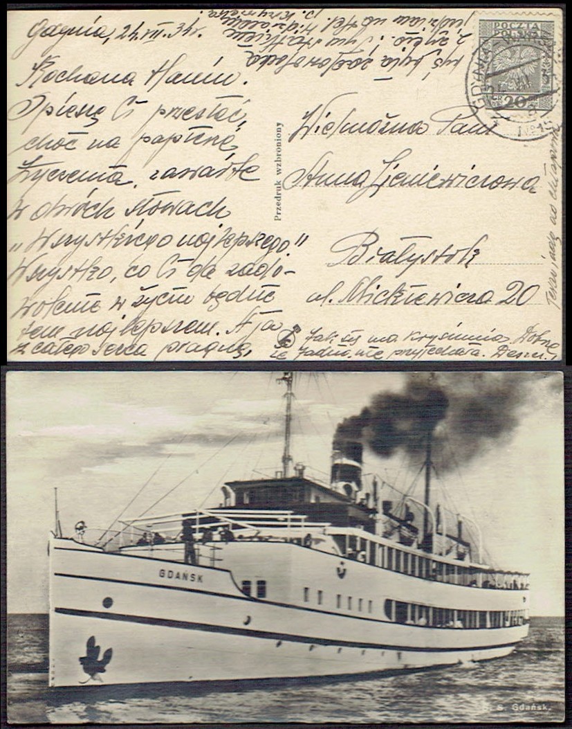 1934 kartka nadana w ambulansie pocztowym nr 15 na trasie Gdynia - Warszawa, datownik z wyróżnikiem a, na widokówce statek Gdańsk. | |