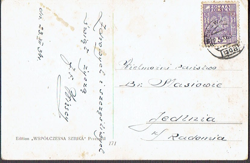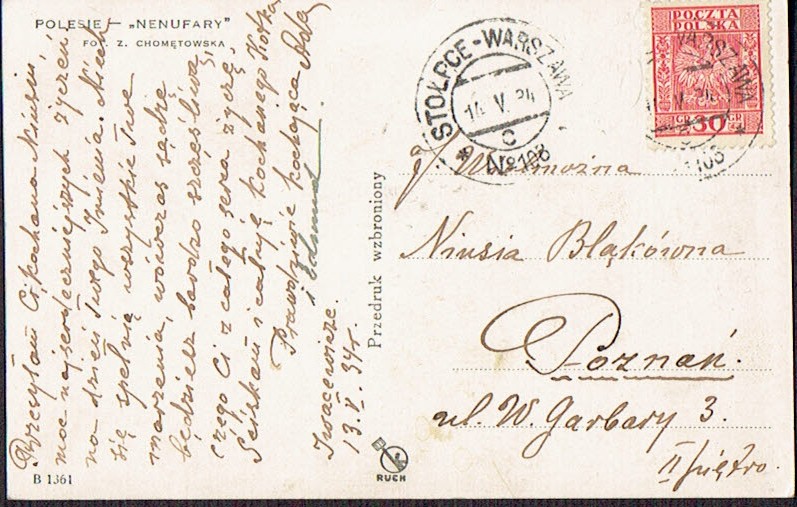 1934 kartka nadana w ambulansie pocztowym nr 108 na trasie Stołpce - Warszawa, datownik z wyróżnikiem c. | |