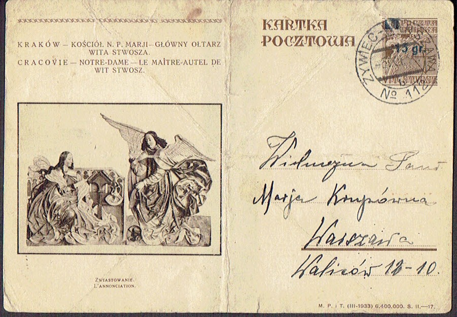 1934 kartka nadana w ambulansie pocztowym nr 112 na trasie Żywiec - Warszawa, datownik z wyróżnikiem b, stan słaby. | |