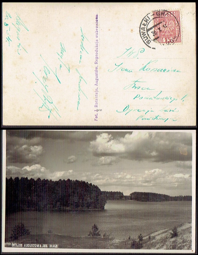 1934 kartka nadana w ambulansie pocztowym nr 294 na trasie Suwałki - Grodno, na widokówce Okolice Augustowa. | |