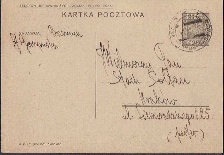 1934 kartka nadana w ambulansie pocztowym na trasie Oświęcim - Kraków nr 337, nietypowe umieszczenie numeru ambulansu w kasowniku. | Fi.Cp64 |