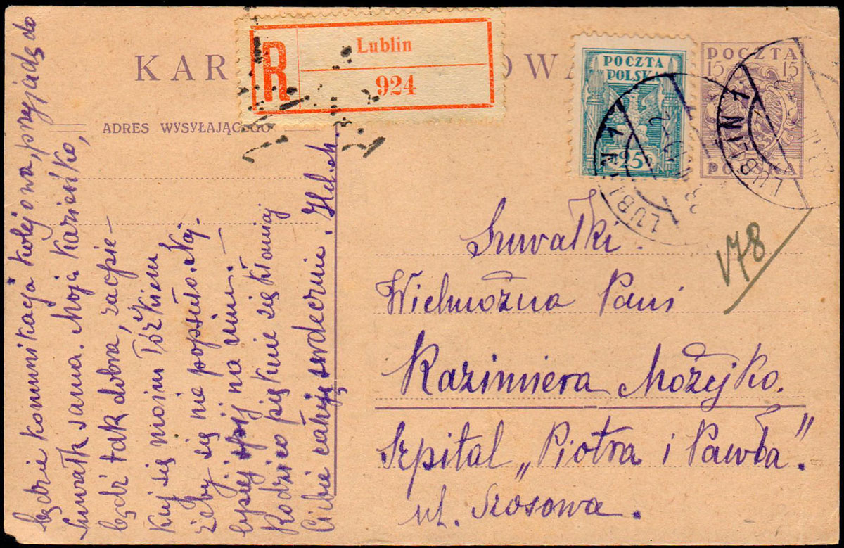 1919 kartka polecona z Lublina do Suwałk, nalepka polecenia "Lublin 1"w kolorze czerwonym. | Fi.78B, Cp25 |