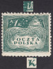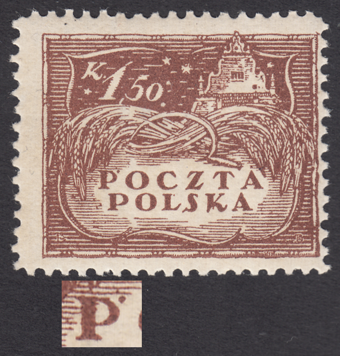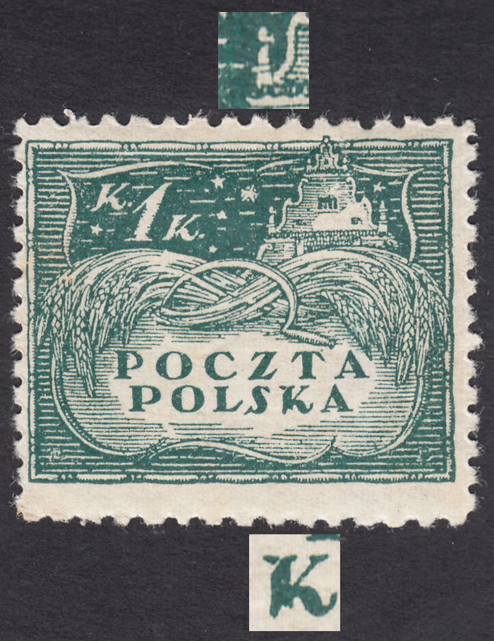 1919 wydanie w walucie koronowej, znaczek za 1 kr. odmiana na cienkim białym papierze z niekatalogowanym - ale opisanym w PZP pod numerem 46, błędem na poz.89 "fajka nad lewą wieżyczką" oraz dodatkowo "odcięte naroże pionowej kreski litery K w POLSKA", ma przebarwienie liczony jak podlepkowy, gwarancja i opis Walocha. | Fi.80B B Mi.84 |