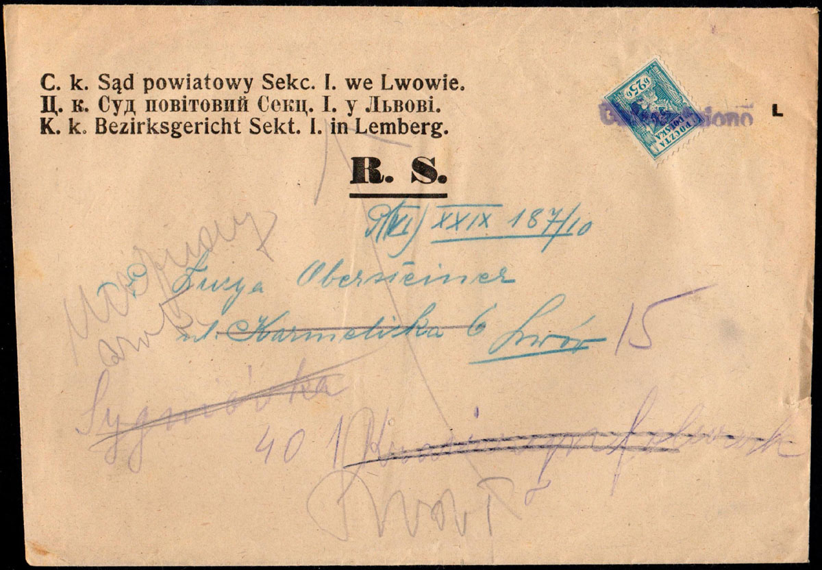 1919 miejscowy list sądowy ze Lwowa, znaczek opłaty skasowanym stemplem „Unieważniono". | Fi.78B |