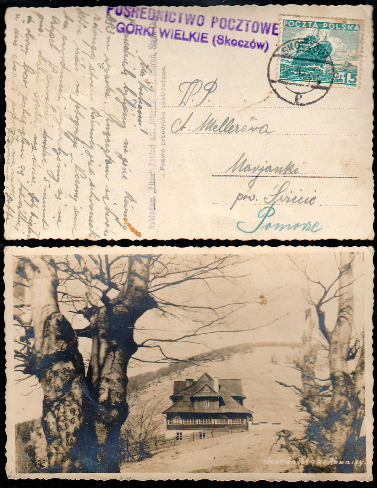 1936 Pośrednictwo Pocztowe Górki Wielkie, kartka Górek Wielkich wysłana do Marjanki na Pomorzu, dwuwierszowy stempel "POŚREDNICTWO POCZTOWE / GÓRKI WIELKIE (Skoczów)" w kolorze fioletowym, znaczek skasowany w nadrzędnym urzędzie pocztowym w Skoczowie, widokówka schronisko na Równicy. | Fi.282 |