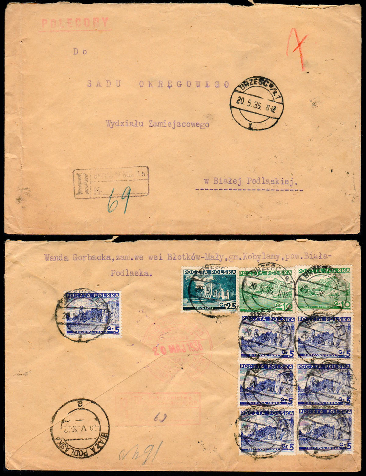 1936 Pośrednictwo pocztowe Biuro Podań M. Starikowa w Brześciu n. Bugiem, list polecony Brześcia do Białej Podlaskiej, czerwony okrągłym stempel "BIURO PISANIA PODAŃ MIKOŁAJA STARIKOWA / POŚREDNICTWO POCZTOWE BRZEŚĆ n/B. ul. Dąbrowskiego 51 / 20 MAJ 1936" oraz pieczątką polecenia w tym samym kolorze "R III Pośrednictwo Pocztowe Brześć n/B." z wpisanym numerem 69, znaczki skasowane w nadrzędnym urzędzie pocztowym Brześć n/B. 1 przystawiając powtórnie pieczątkę polecenia tego urzędu z tym samym numerem, który oznaczono w pośrednictwie pocztowym, stempel odbiorczy. | Fi.280, 281, 284 |