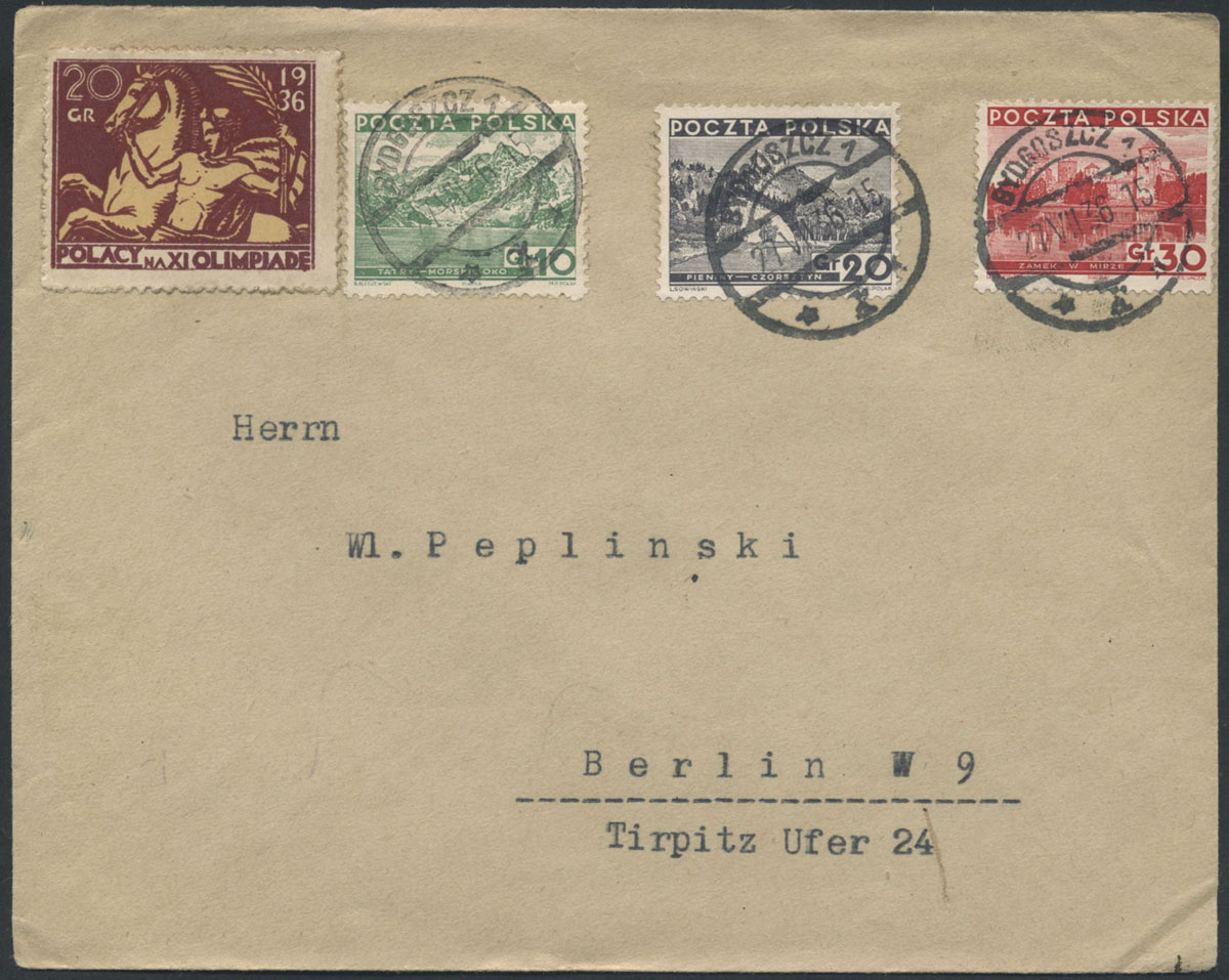 1936 list z Bydgoszczy do Niemiec, nalepka "POLACY NA X OLIMPIADĘ". | Fi.281, 283, 285 |