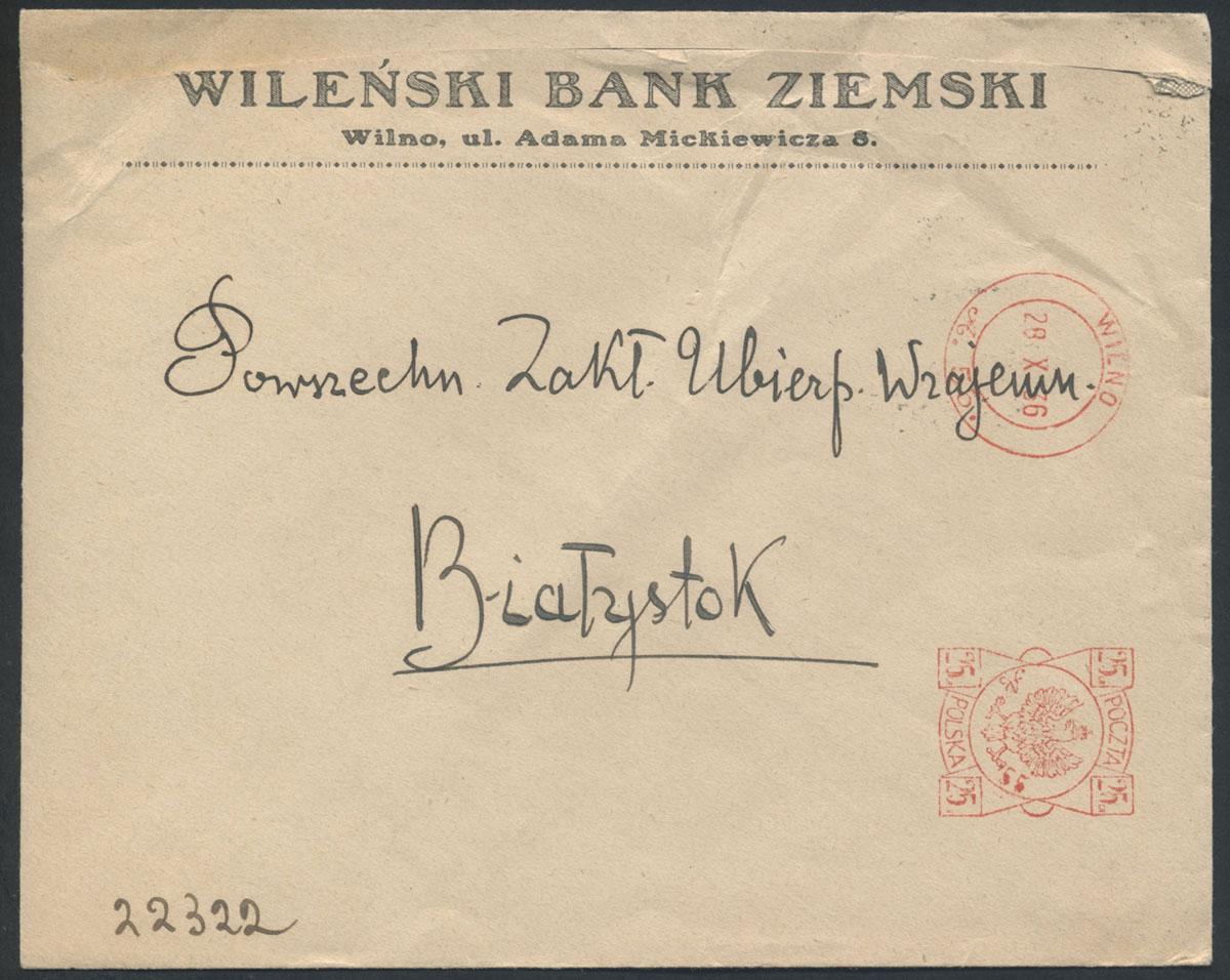 1936 list z Wileńskiego Banku Ziemskiego do Białegostoku opłacony frankaturą mechaniczną nr "A. 56.". | |