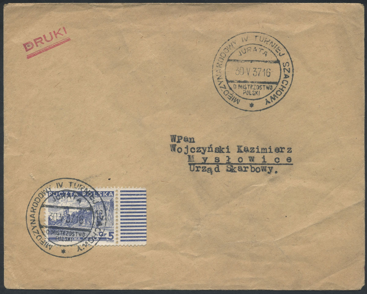 1937 "MIĘDZYNARODOWY IV TURNIEJ SZACHOWY O MISTRZOSTWO POLSKI JURATA" rzadki stempel okolicznościowy (Myślicki 37 011) na liście z Juraty do Mysłowic. | Fi.280 |