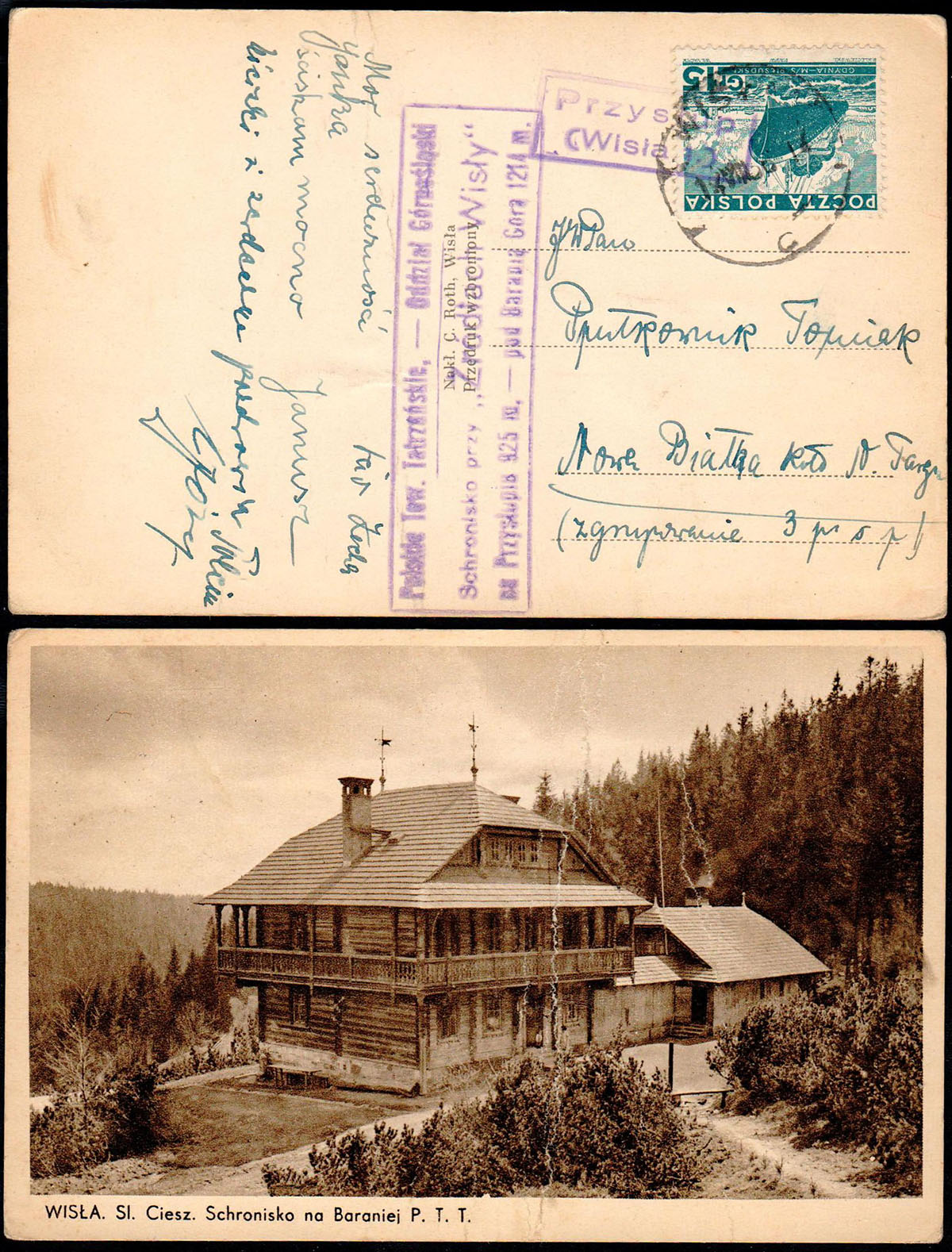 1937 Pośrednictwo Pocztowe PRZYSŁUP (WISŁA 1), kartka ze schroniskiem na Baraniej Górze wysłana z Wisły do Nowej Białki k. Nowego Targu ze stempelkiem pośrednictwa pocztowego Przysłup (Wisła 1) w kolorze fioletowym, ponadto pieczęć Polskiego Towarzystwa Tatrzańskiego Oddział Górnośląski - Schronisko przy "Źródłach Wisły", widokówka schroniska, ślad zagięcia kartki | Fi.282 |