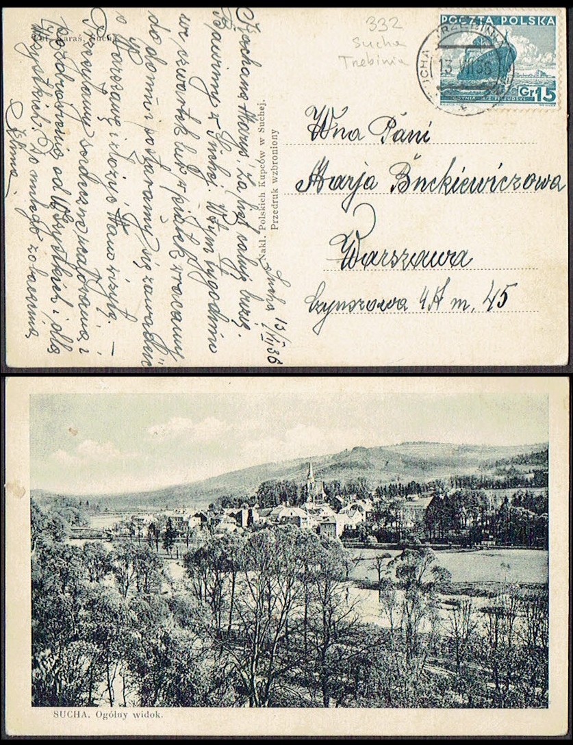 1936 kartka nadana w ambulansie pocztowym nr 332 na trasie Sucha - Trzebinia, datownik z wyróżnikiem a, datownik z tego ambulansu jest bardzo rzadko spotykany, na widokówce Sucha - Ogólny widok. | |