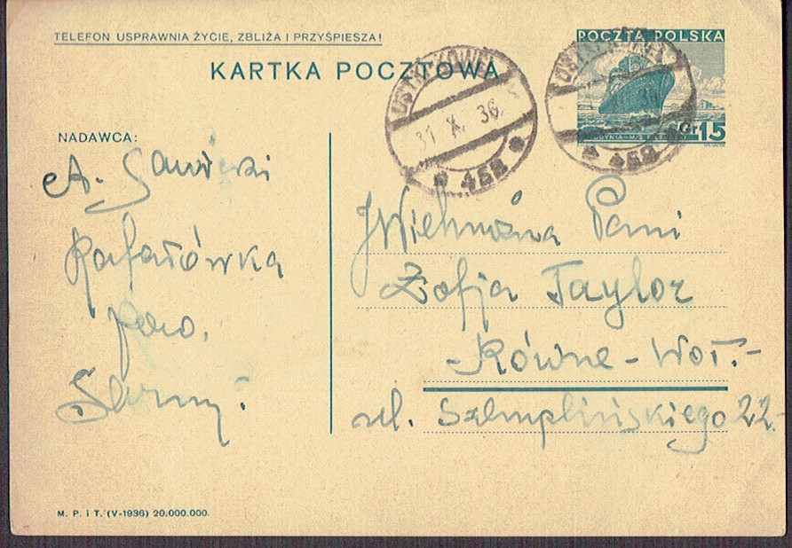 1936 kartka nadana w ambulansie pocztowym nr 458 na trasie Ostki - Kowel. | |