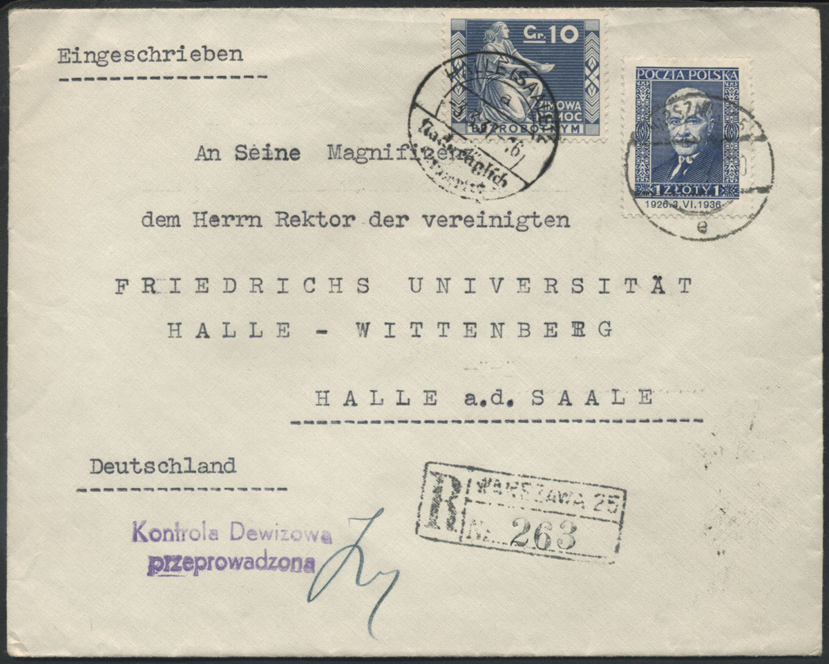 1937 list polecony z Warszawy do Niemiec, stempel kontroli dewizowej, nalepka na rzecz pomocy zimowej ostemplowana w Niemczech, gdzie zapewne uznano ją za nieskasowany znaczek. | Fi.291 |