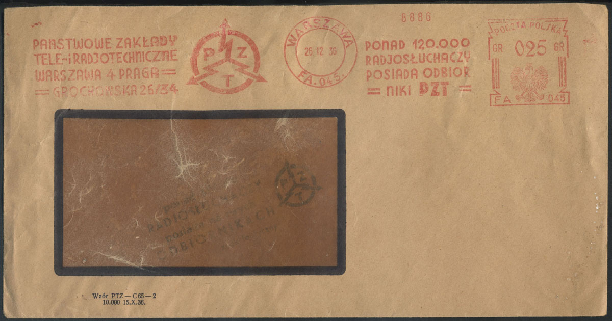 1936 firmowy list z Państwowych Zakładów Tele- i Radijotechnicznych w warszawie opłacony frankaturą mechaniczną "F.A. 045.". | |