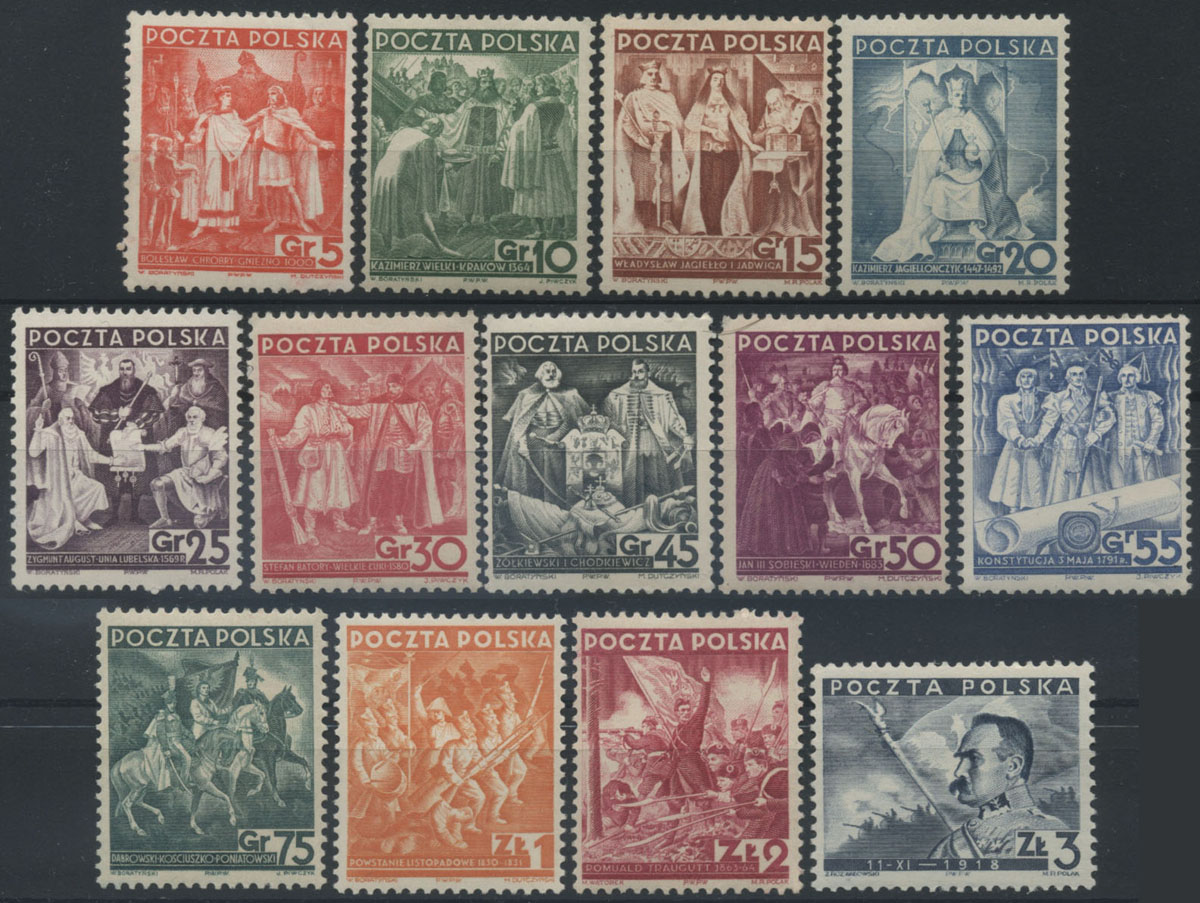 1938 20. rocznica odzyskania niepodległości - seria historyczna, w tym dwa znaczki za 15 gr: Fi.312 - w dolnej części widać dwa krzyżackie miecze - odwołanie do bitwy pod Grunwaldem z 1410 roku, wskutek niemieckiej interwencji dyplomatycznej, sporządzono nowy nakład, gdzie w miejscu mieczy umieszczono tarczę z Orłem Białym i Pogonią oraz lilie andegaweńskie - Fi.334, dodatkowo przygotowane z tej samej okazji pierwsze definitywne wydanie Portu Gdańsk; czyste (Fi.302,50); bardzo dobry stan zachowania. | Fi.310-22, 31-4 Mi.331-43, 34-7 |