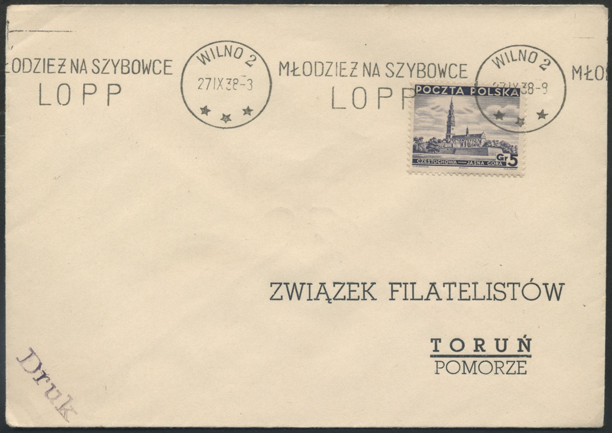 1938 rzadki wirnik okolicznościowy z Wilna "MŁODZIEŻ NA SZYBOWCE LOPP" (Myślicki 38 115). | Fi.294 |