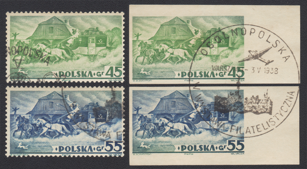 1938 V Ogólnopolska Wystawa Filatelistyczna w Warszawie, seria stemplowanych znaczków perforowanych z bloku. | Fi.306-7B Mi.327-8B |