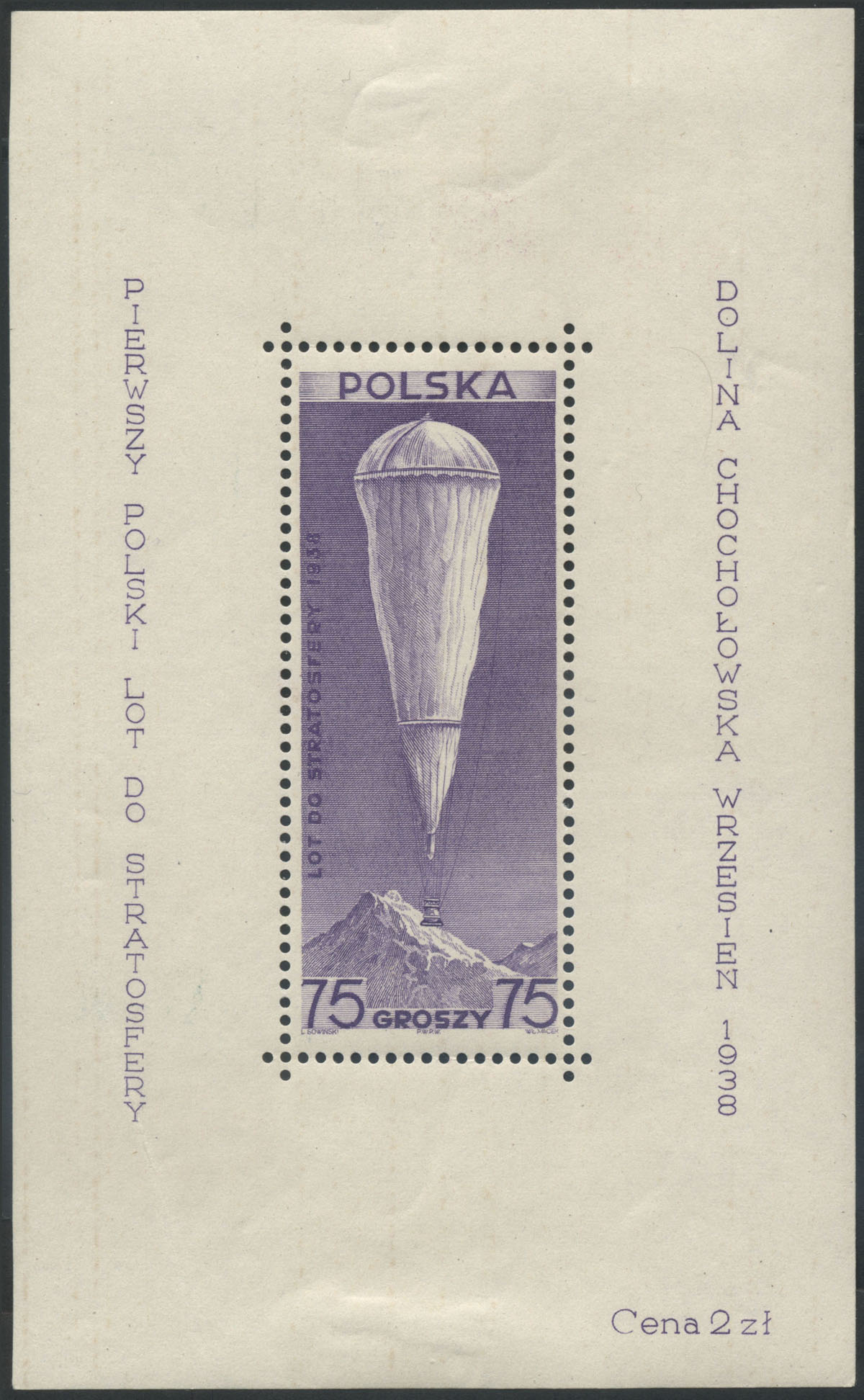1938 pierwszy polski lot do stratosfery, blok czysty na jednej podlepce, liczony jako znaczek z bloku bez podlepki (Fi.240.-). | Fi.308 (bl.6) Mi.329 |