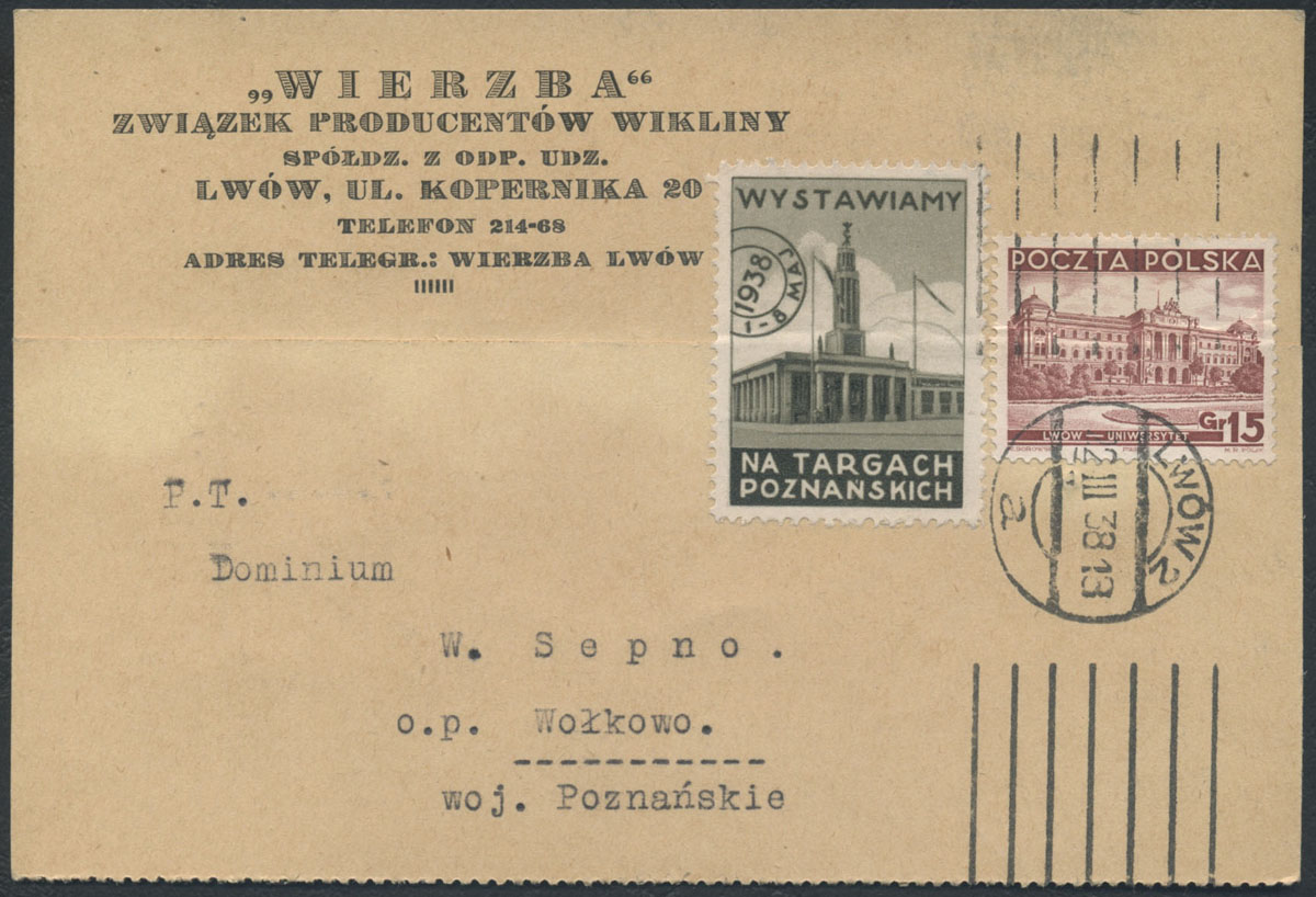 1938 kartka z Lwowa do Sepna, nalepka promująca Targi Poznańskie. | Fi.296 |