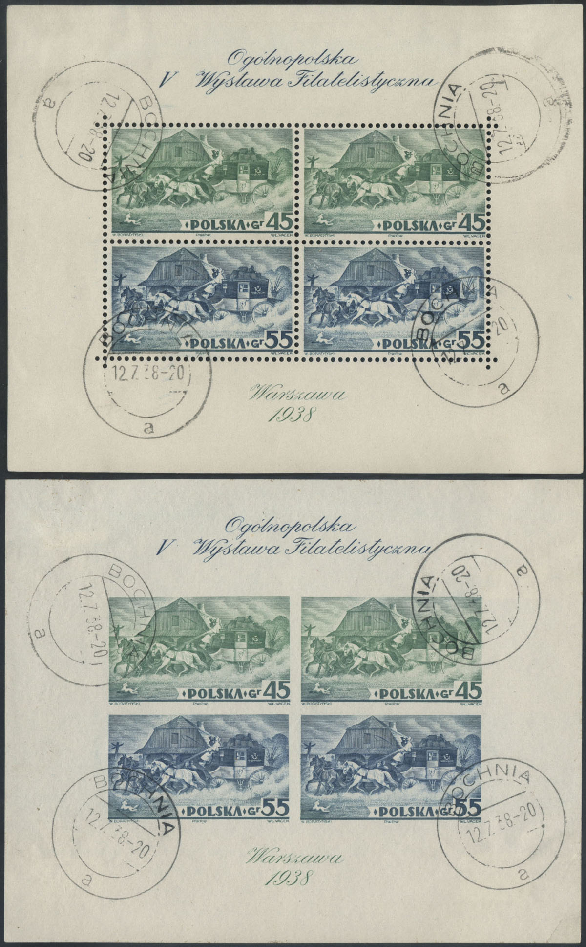 1938 V Ogólnopolska Wystawa Filatelistyczna w Warszawie, bloki stemplowane, blok cięty dwie minimalne prześwitki po podlepkach. | Fi.bl.5A, B Mi.Bl.5A, B |