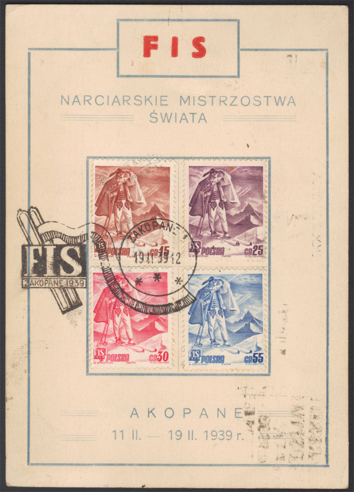 1939 Międzynarodowe Zawody Narciarskie FIS w Zakopanem, brak litery Z w ZAKOPANE rzadka usterka oficjalnej karty!!! ofrankowanej serią znaczków okolicznościowo ostemplowanych 19.II; karta przesłana do Warszawy, na odwrocie odbitka nadawczego wirnikowego stempla okolicznościowego o stopniu rzadkości C według katalogu Myślickiego; bardzo dobry stan zachowania (Myślicki 39 106). | Fi.330-33 Mi.351-54 |