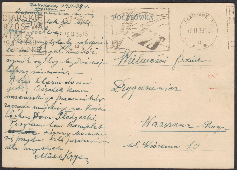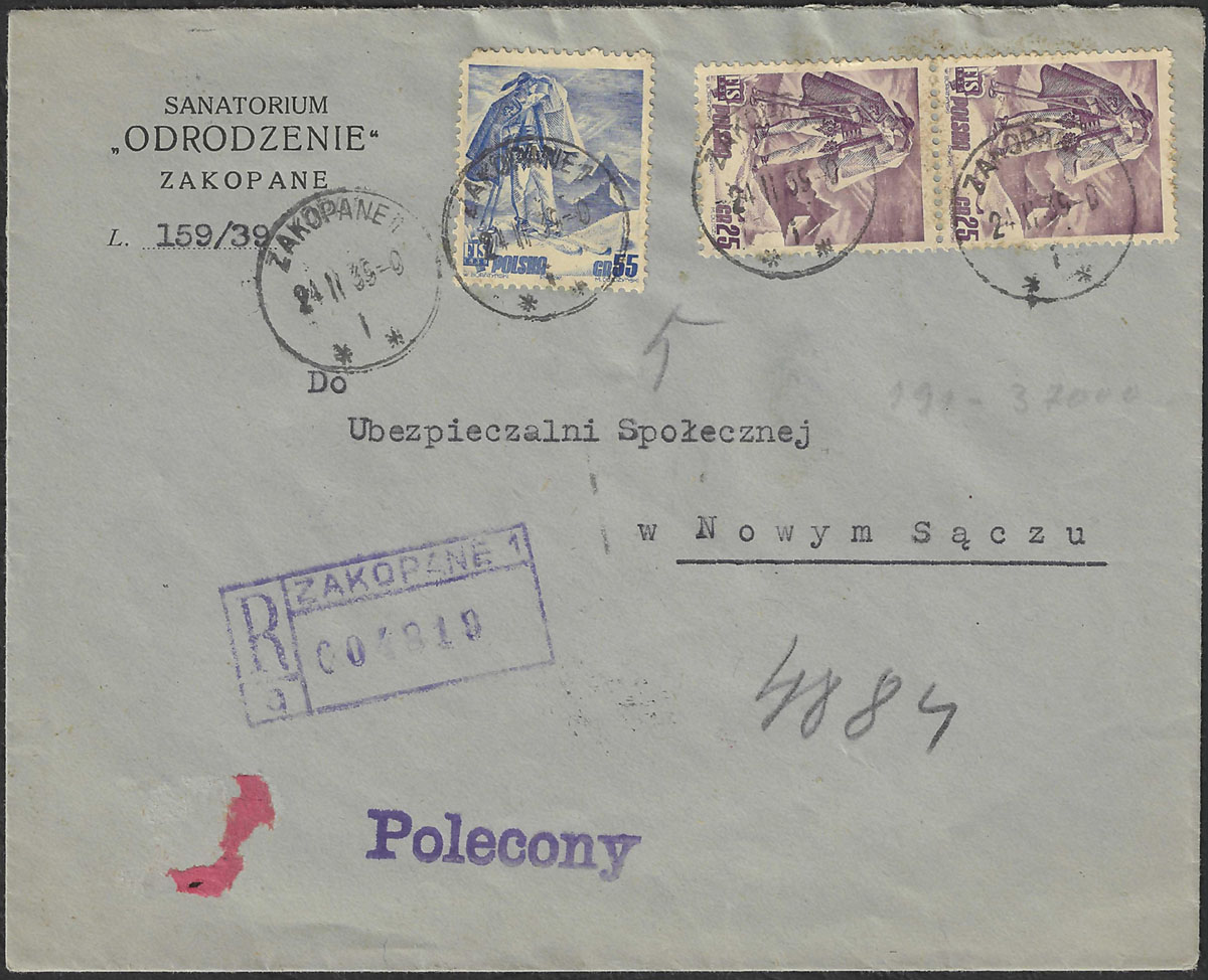 1939 list polecony z Zakopanego do Nowego Sącza, na odwrocie stempel odbiorczy. | Fi.331, 333 |