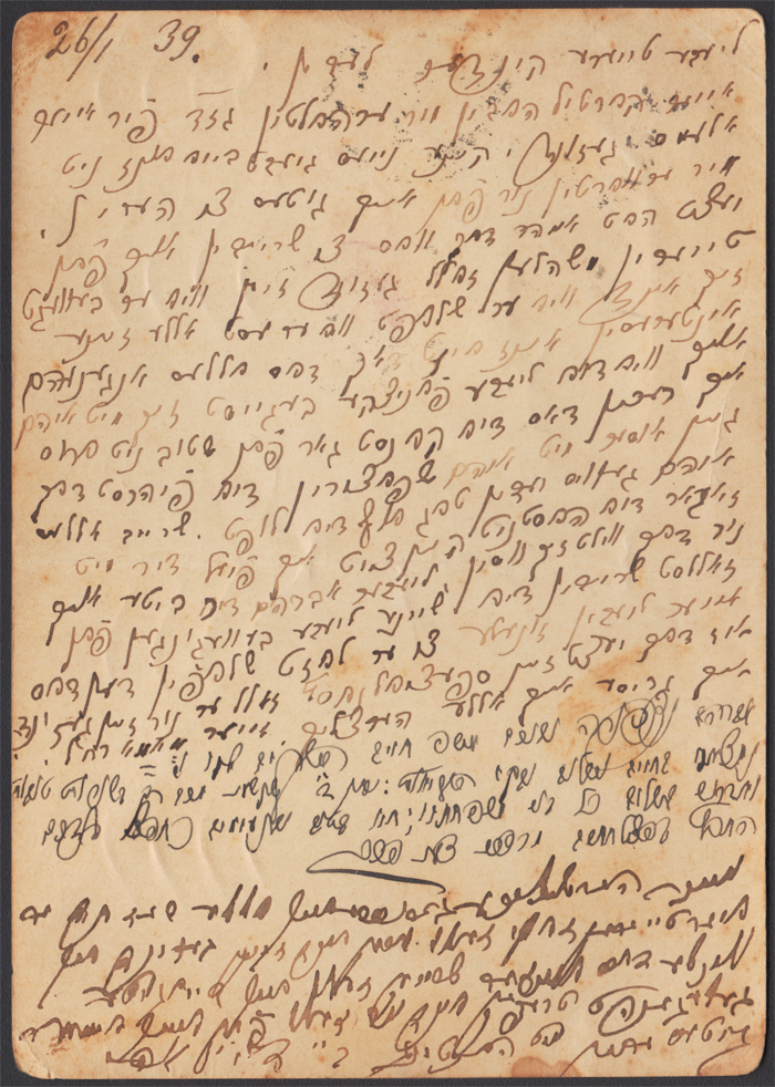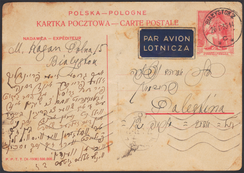 1939 całostka za 30 gr (Jagiellończyk) jako lotnicza wysłana 26.I z urzędu Białystok 2 do Palestyny, stempel urzędu przejściowego "WARSZAWA 2 LOT", treść pisana po hebrajsku; słaby stan zachowania. | Fi.Cp84 |
