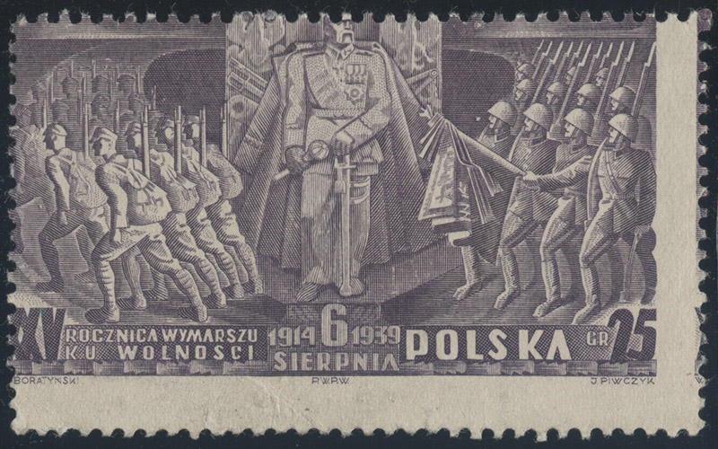 1939 25. rocznica wymarszu I Kompanii Kadrowej Legionów, makulaturowy znaczek bez gumy z silnie przesuniętą perforacją, poziome zagięcie widoczne na odwrocie, gwarancja Schmutz. | Fi.335MK Mi.356 |