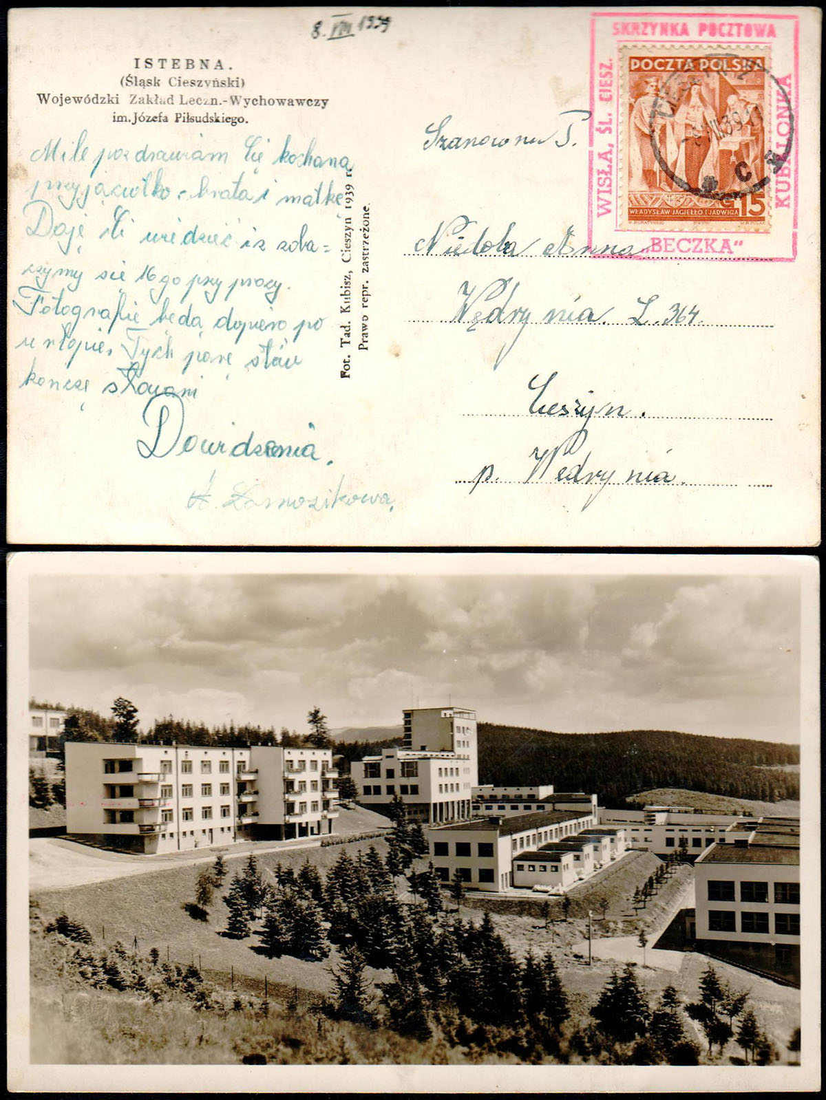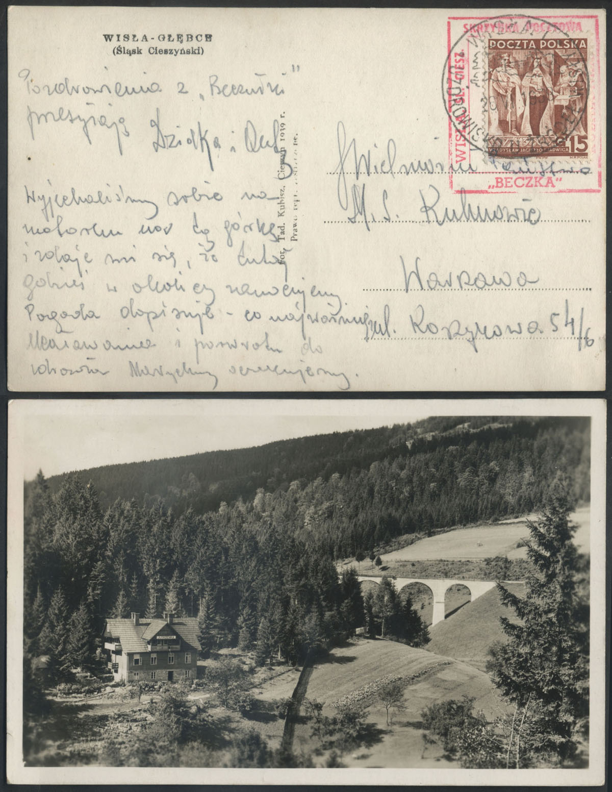 1939 kartka z Wisły do Warszawy, rzadki stempel "SKRZYNKA POCZTOWA WISŁA, Śl. CIESZ. "BECZKA" KUBALONKA", okolicznościowy kasownik z Wisły "UZDROWISKO U ŹRÓDEŁ WISŁY", widokówka z Wisły. | Fi.334 |