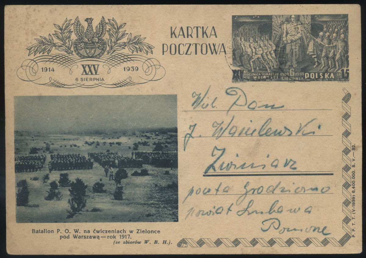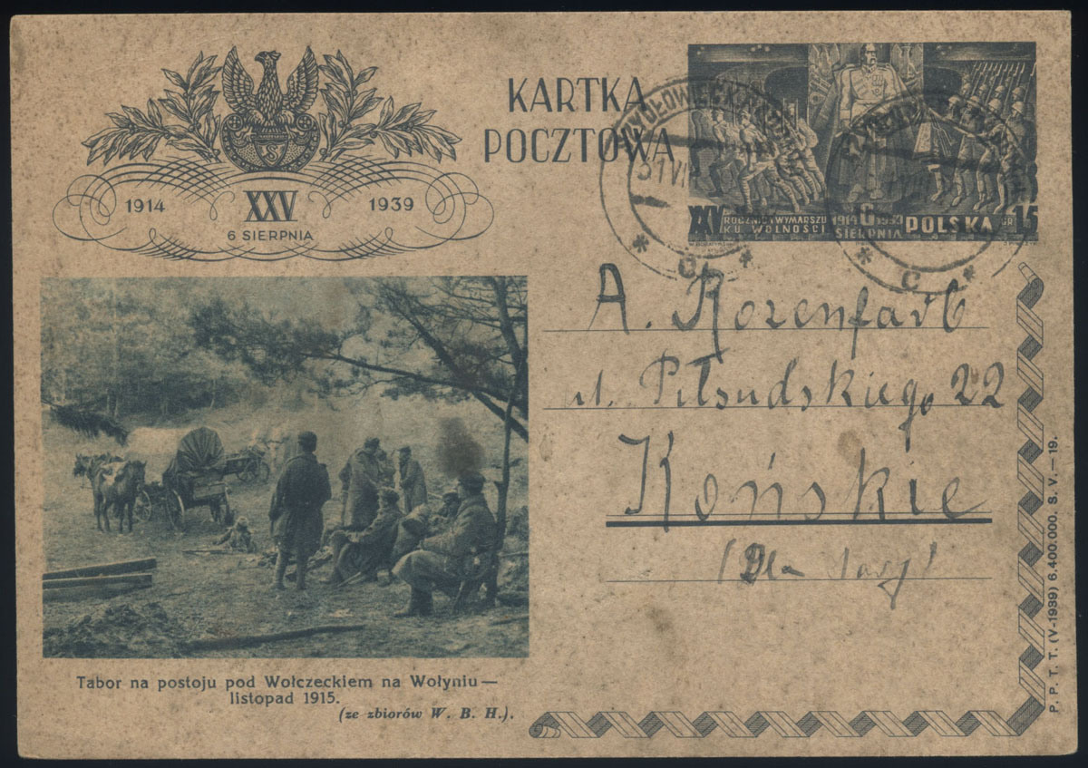 1939 25. rocznica wymarszu Legionów Piłsudskiego, odbitki stempla okolicznościowego z Krakowa. | Fi.335 |