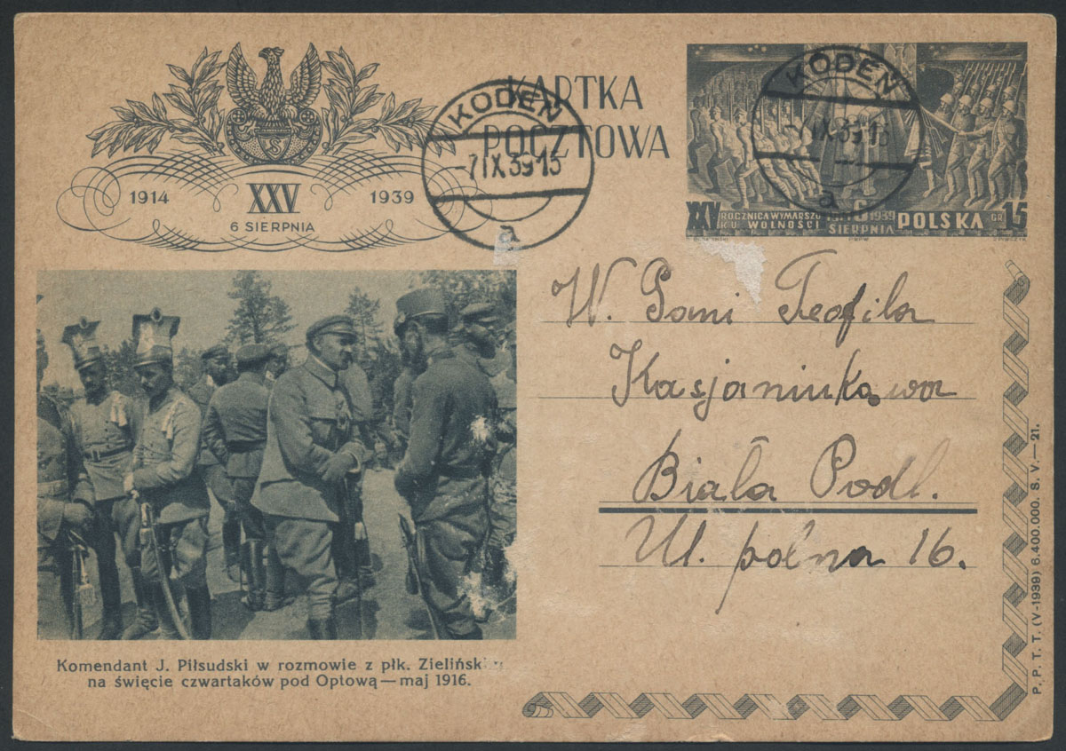 1939 kartka nadana po wybuchu wojny 7.09.39 z Kodenia do Białej Podlaskiej. | Fi.Cp88 |