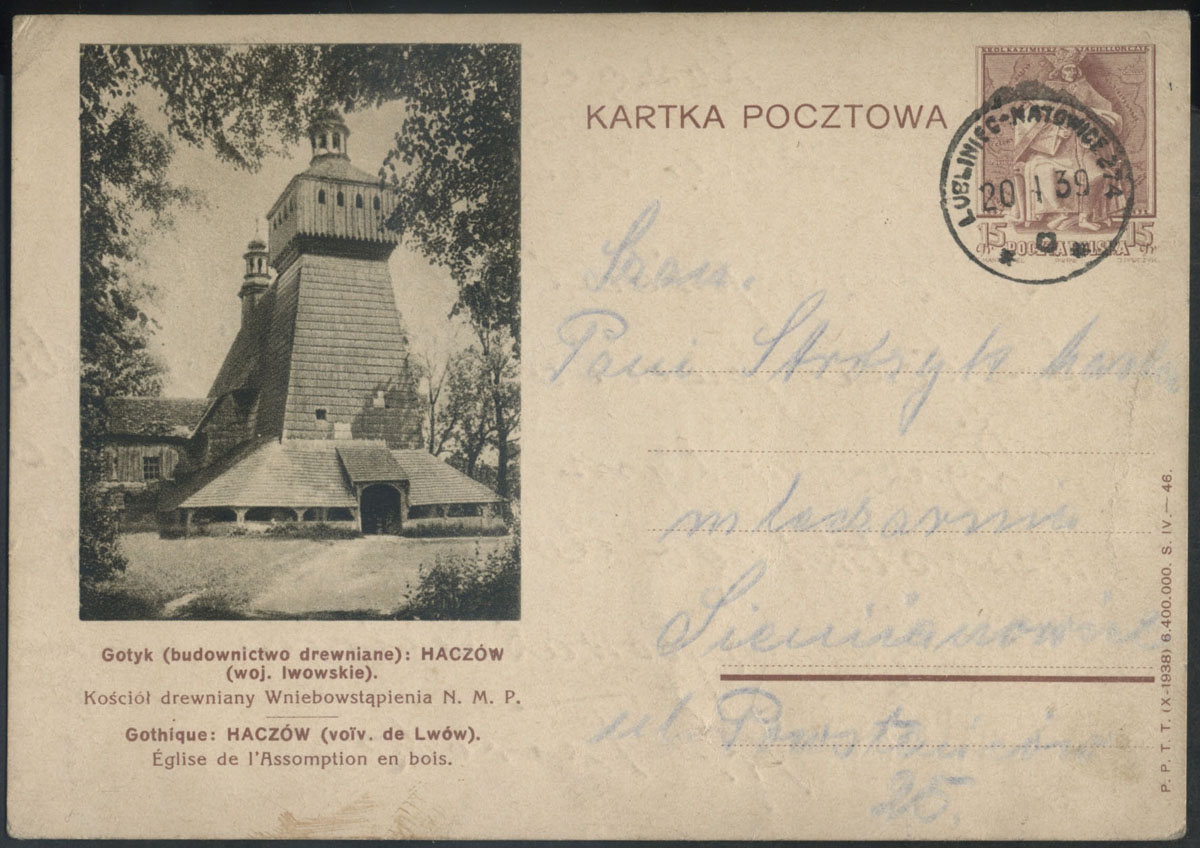 1939 kartka nadana w ambulansie pocztowym na trasie Lwów - Kiwerce nr 379, kasownik z wyróżnikiem b. | Fi.Cp76 |