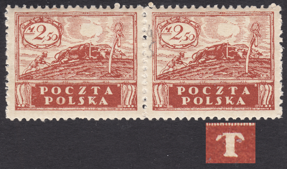 1919 wydanie w walucie markowej, parka czystych znaczków za 2,50 mk., prawy z niekatalogowanym - ale opisanym w PZP pod numerem 236 lub 237, błędem na poz.45 w sektorze 1 lub 2, albo na poz.52 lub 57 w sektorze 3. "lewy daszek litery T uszkodzony", gwarancja i opis Walocha. | Fi.95B B Mi.112Y |