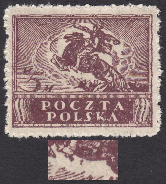 1919-20 wydanie markowe dla obszaru całej Rzeczypospolitej (Fi. nakład C), znaczek za 5 mk. w kolorze brązowolila na prążkowanym pionowo papierze z nakładu drukowanego od maja do sierpnia 1920 roku, z niekatalogowanym błędem "plamka pod brzuchem konia", gwarancja i opis Walocha. | Fi.96C B Mi.114w |