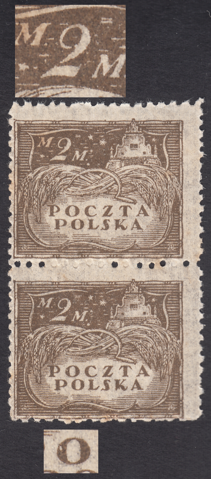 1919-20 wydanie markowe dla obszaru całej Rzeczypospolitej (Fi. nakład C), pionowa parka znaczków za 2 mk. na prążkowanym pionowo papierze z nakładu drukowanego od maja do sierpnia 1920 roku, oba z niekatalogowanymi błędami, górny z "odcięta podstawa cyfry 2", a dolny, "biała plamka w literze O w POCZTA", gwarancja i opis Walocha. | Fi.94C B Mi.111zI |