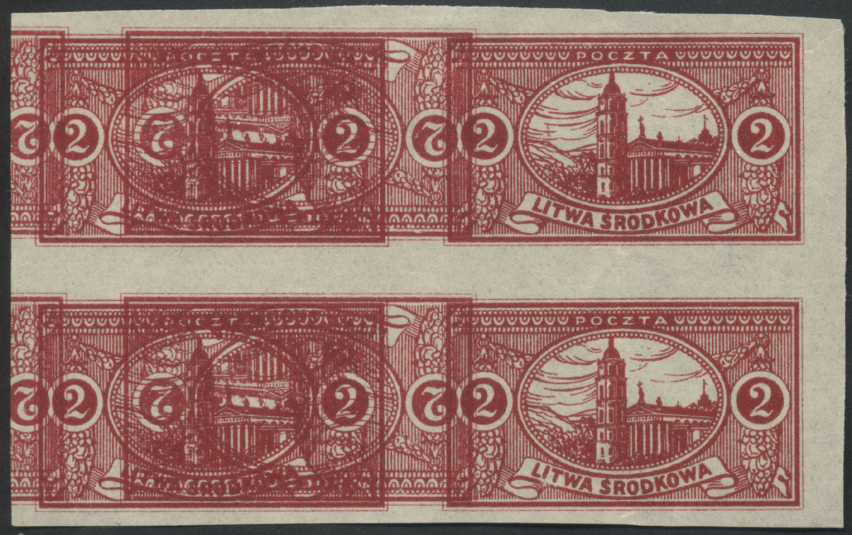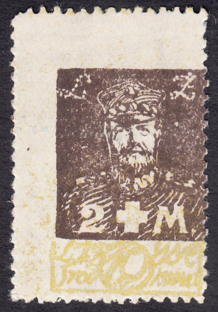1921 wydanie na rzecz Polskiego Białego Krzyża - Gen.l.Żeligowski, makulatura wykończonego znaczka za 10 mk. z lekko wzajemnie przesuniętymi kolorami, rozmytym na całej powierzchni oliwkowożółtym oraz znacznym przesunięciem ząbkowania poziomego i pionowego, gwarancja Walocha. | Fi.33B MK Mi.33A |