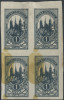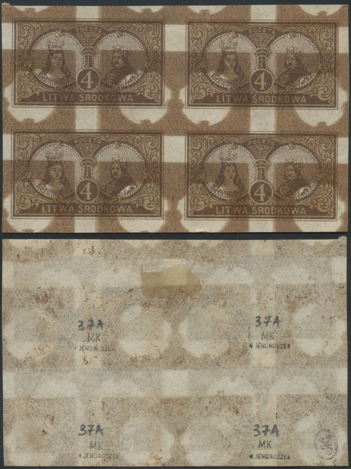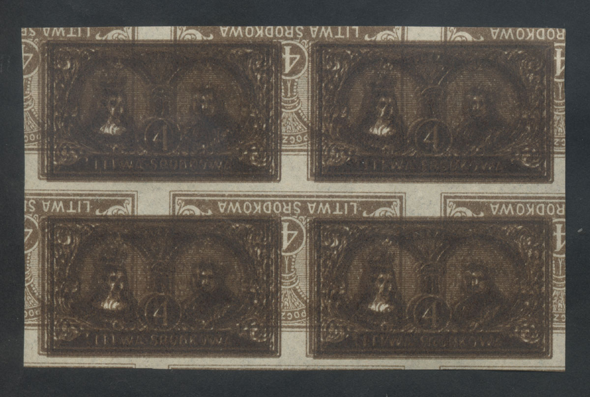 1921 Królowa Jadwiga i Król Jagiełło, czworoblok znaczków za 4 mk. z przesuniętym drukiem tła i podwójnym ząbkowaniem naroża. | Fi.37B Mi.37A |