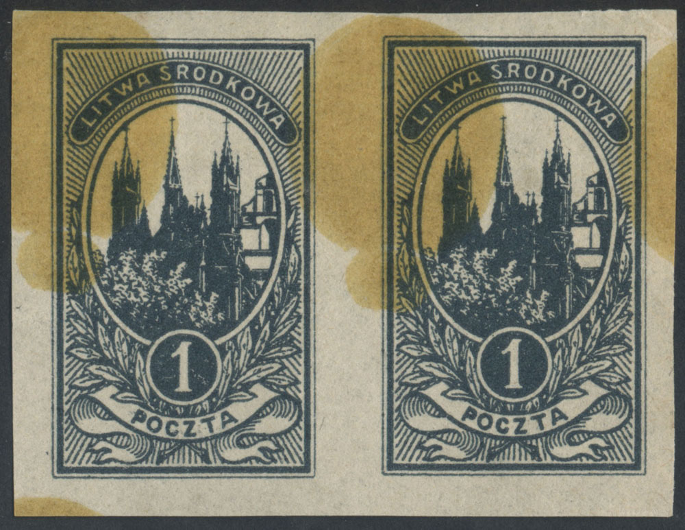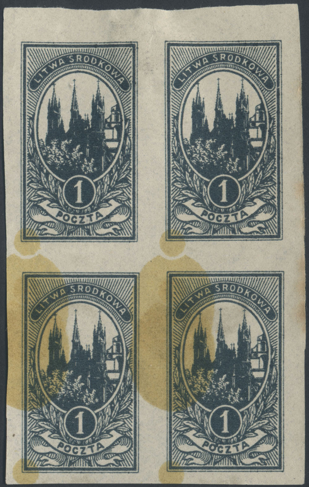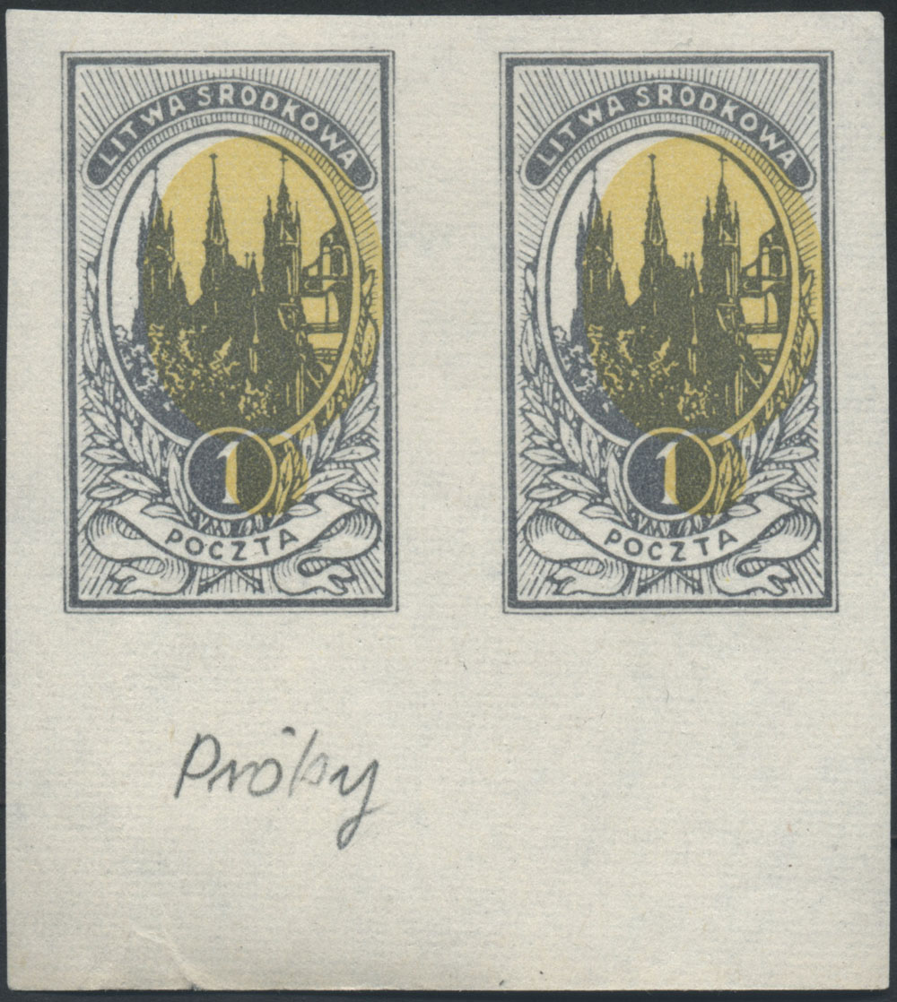 1921 Kościół św.Anny w Wilnie, próba znaczka za 1 mk. w kolorze czarnoniebieskim bez tła (Fi.150.-), na dole podwójny druk próby w położeniu wzajemnie odwróconym, a na odwrocie próba kliszy żółtej - na dole podwójnej, w tym jednej w położeniu odwróconym, gwarancja Krawczyk. | Fi.34 P2 + P2 Dp |