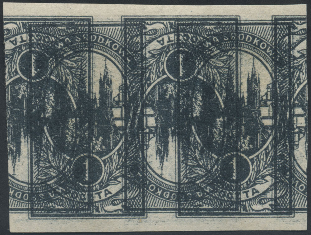 1921 Królowa Jadwiga i Król Jagiełło, makulatura marginesowego znaczka za 4 mk. z przesuniętym w prawo tłem i dodatkowo na wielokrotnym druku tła znaczka za 1 mk. obróconym o 90°, gwarancja i oznaczenie. | Fi.37A MK Mi.37B |