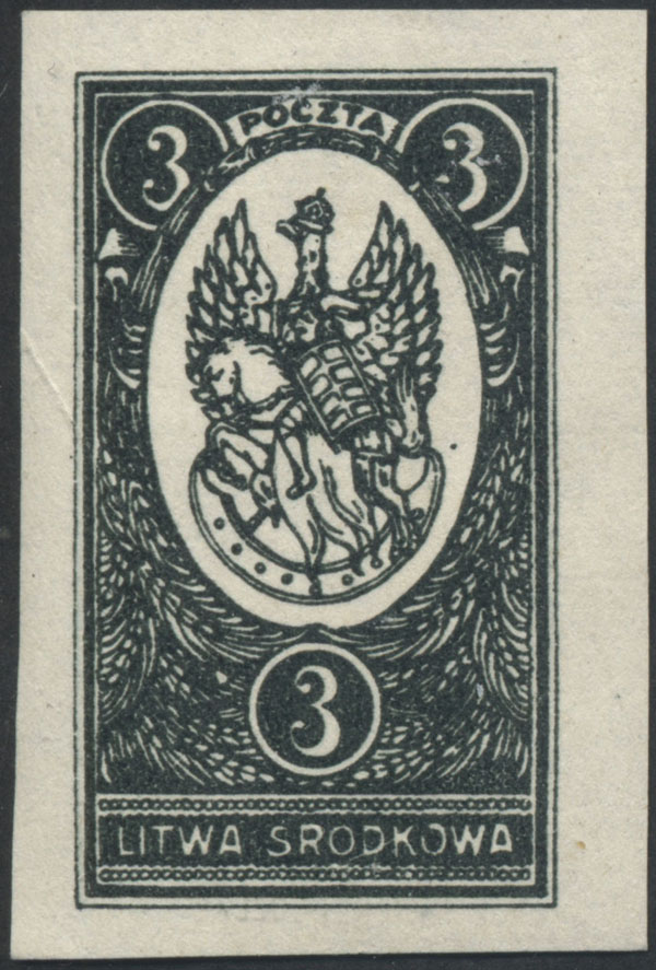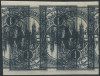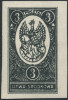 1921 Pogoń na tle Orła Białego, niegumowana próba arkuszowa znaczka w kolorze szaroczarnym bez tła z drukiem potrójnym, gwarancja Schmutz. | Fi.36 P Dp |